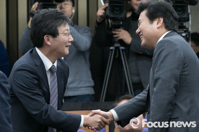 (서울=포커스뉴스) 원유철(오른쪽) 새누리당 원내대표와 유승민 의원이 8일 오후 서울 여의도 국회에서 열린 의원총회에 참석해 악수하고 있다.