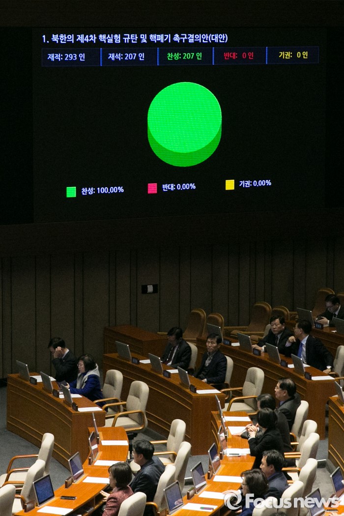 (서울=포커스뉴스) 19대 국회 12월 임시국회 마지막날인 8일 오후 서울 여의도 국회 본회의장에서 북한의 제4차 핵실험 규탄 및 핵폐기 촉구 결의안이 통과되고 있다.