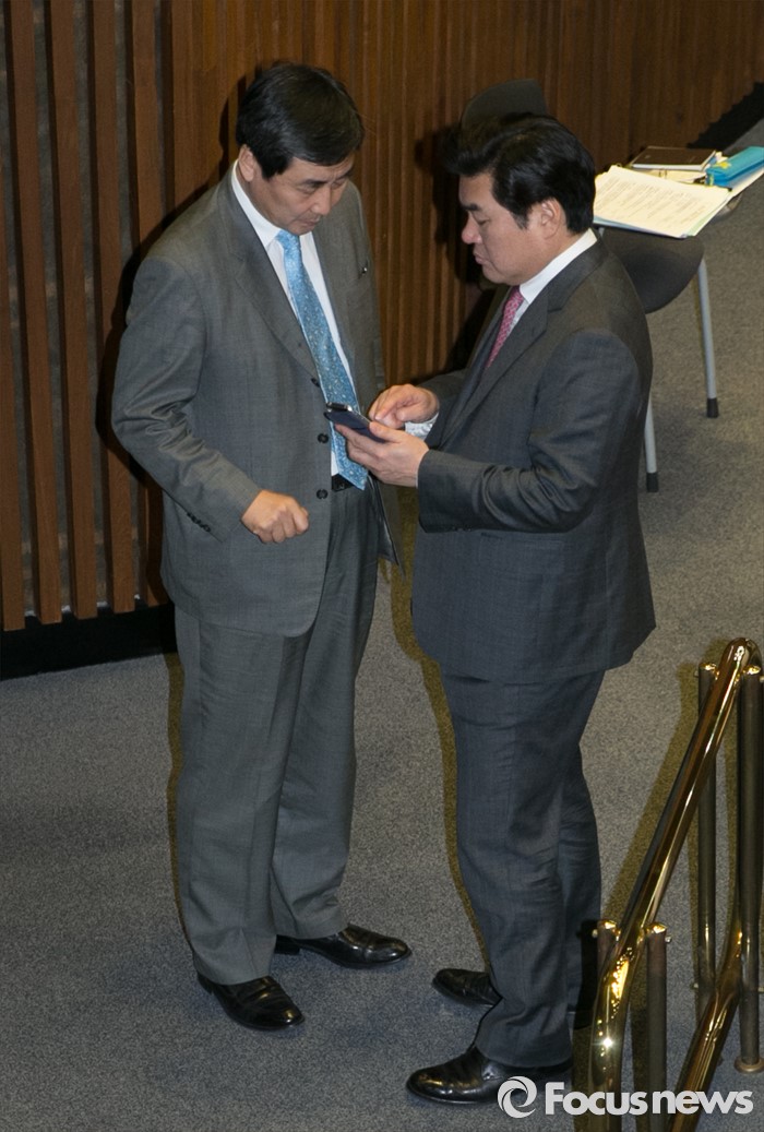 (서울=포커스뉴스) 8일 오후 서울 여의도 국회에서 열린 338회 국회(임시회) 3차 본회의에 참석한 원유철(오른쪽) 새누리당 원내대표와 이종걸 더불어민주당 원내대표가 대화하고 있다.