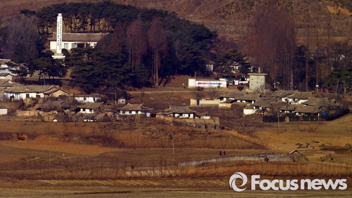 (파주=포커스뉴스) 군 당국의 대북확성기 방송 재개를 앞둔 8일 오전 경기도 파주 오두산 통일전망대에서 바라본 북한 개풍군 마을 주민들이 평온한 모습을 보이고 있다.