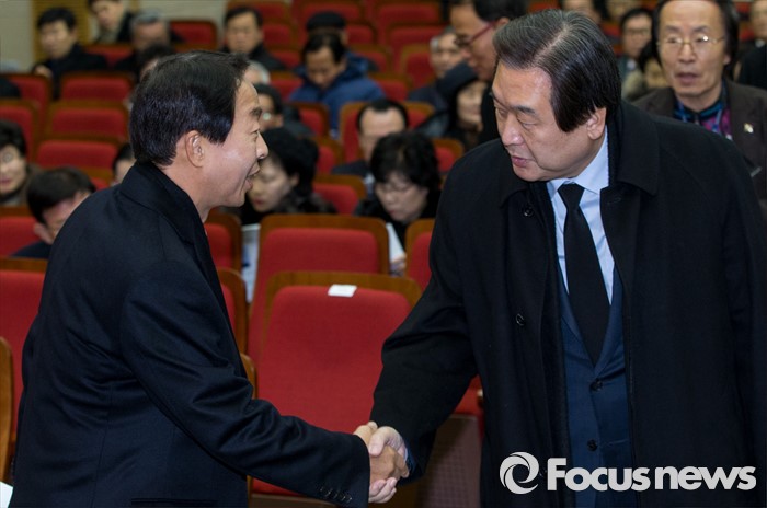 (서울=포커스뉴스) 9일 오후 서울 동작구 국립현충원에서 열린 '김영삼 대통령 추모 부활 성시 기념예배'에 참석한 차남 김현철(왼쪽) 씨가 김무성 새누리당 대표와 악수하고 있다.