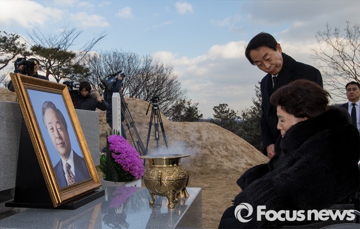(서울=포커스뉴스) 9일 오후 서울 동작구 국립현충원에서 열린 '김영삼 대통령 추모 부활 성시 기념예배'가 마친 후 손명순 여사와 차남 김현철 씨가 김 전 대통령 묘소에서 참배하고 있다.