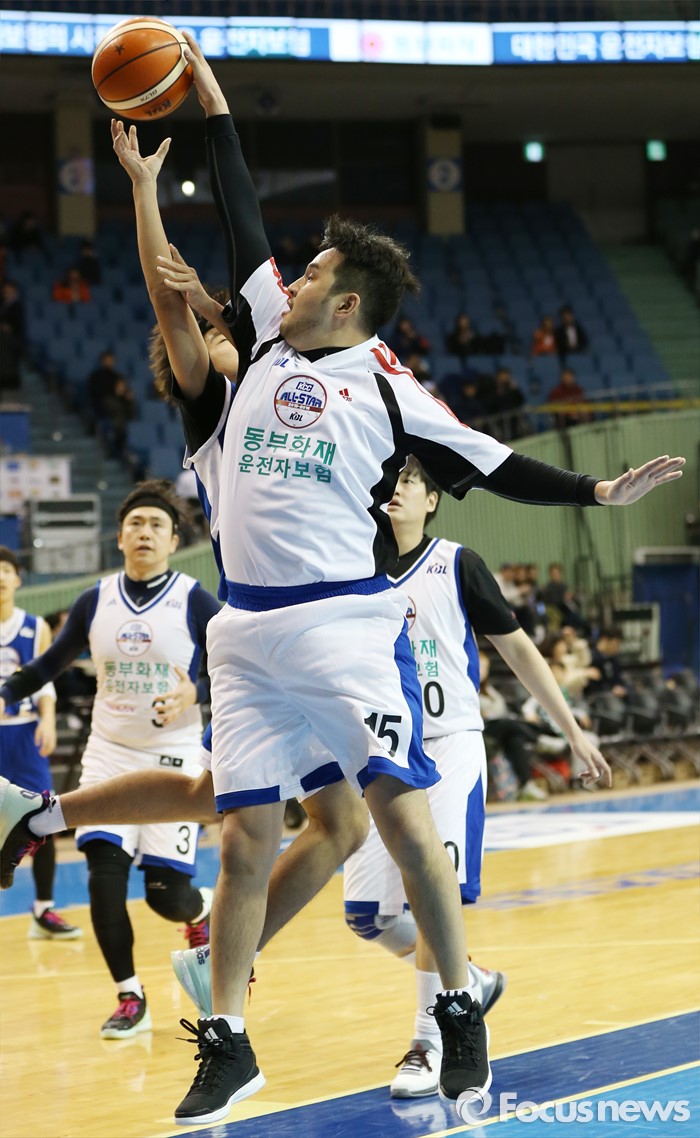 (서울=포커스뉴스) 15일 서울 잠실실내체육관에서 열린 2015-2016 프로농구 올스타전 오프닝 행사로 열린 연예인 농구팀-유소년 올스타 경기에서 연예인 농구팀 가수 김태우가 장신을 이용해 슛블록을 하고 있다.