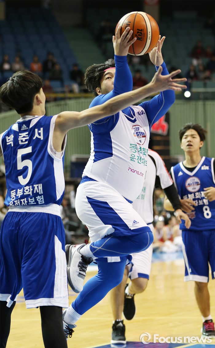 (서울=포커스뉴스) 10일 서울 잠실실내체육관에서 열린 2015-2016 프로농구 올스타전 오프닝행사인 연예인농구팀-유소년 올스타 경기에서 연예인팀 김기방이 육중한 몸으로 레이업슛을 시도하고 있다.