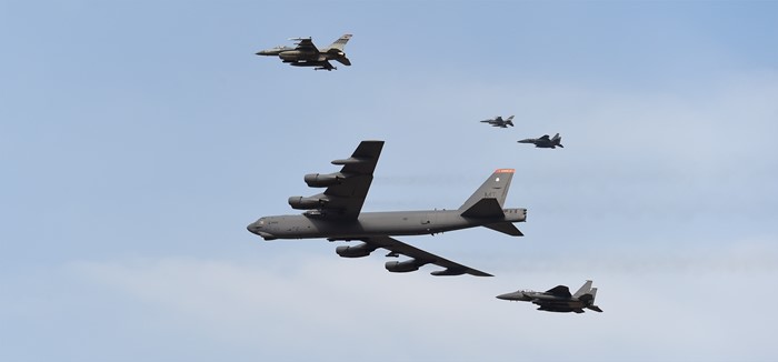 (서울=포커스뉴스) 북한의 수소폭탄 실험 이후 미국의 핵우산 제공 방침에 따라 미 공군의 전략 폭격기가 한반도로 전개한 10일 경기도 평택시 주한미군 오산공군기지 상공에 B-52 폭격기와 우리 공군의 F-15K와 미군 F-16 전투기의 호위를 받으며 비행하고 있다. <사진제공=국방일보>