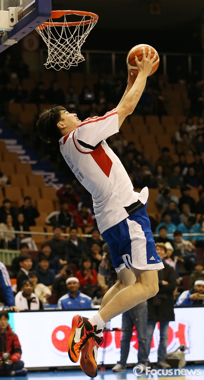 (서울=포커스뉴스) 10일 서울 잠실실내체육관에서 열린 2015-2016 프로농구 올스타전 덩크슛 콘테스트 예선에서 김종규가 백 덩크슛을 시도하고 있다.