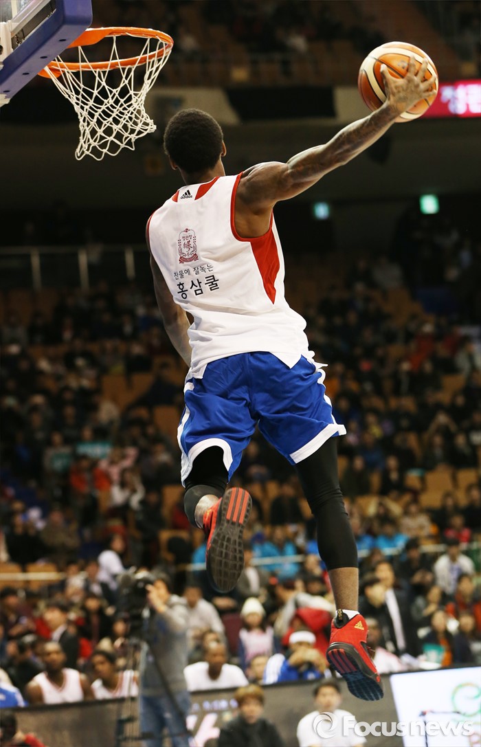 (서울=포커스뉴스) 10일 서울 잠실실내체육관에서 열린 2015-2016 프로농구 올스타전 덩크슛 콘테스트 예선에서 조 잭슨이 원핸드 덩크슛을 시도하고 있다.