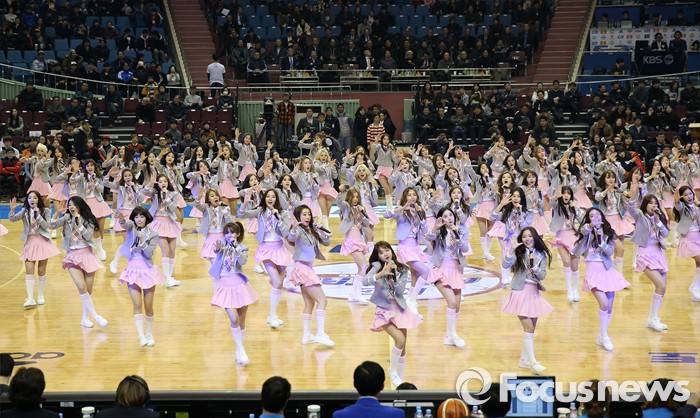 (서울=포커스뉴스) 10일 서울 잠실실내체육관에서 열린 2015-2016 프로농구 올스타전에서 101명의 걸그룹 연습생들이 합동공연을 펼쳐 코트의 열기를 달구고 있다.
