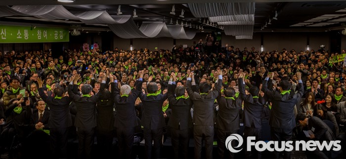 의당(가칭) 창당발기인대회'에서 주요 창당준비 관계자들과 손을들고 발기인들에게 인사하고 있다.