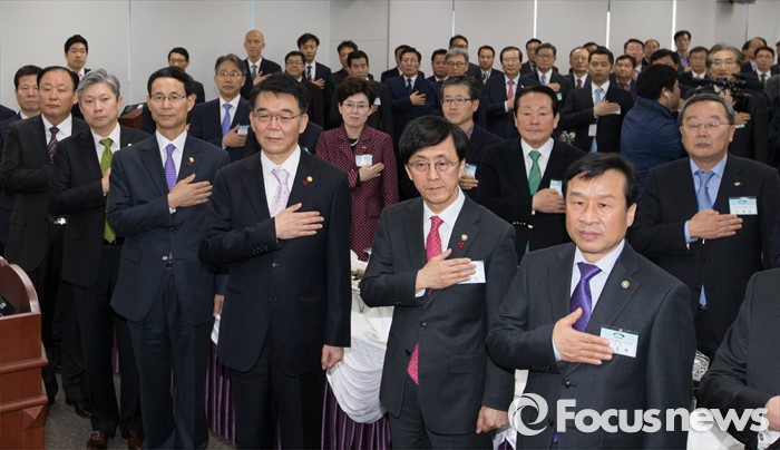 (세종=포커스뉴스) 강호인 국토교통부장관이 11일 오전 세종시 정부세종청사 국토부 대회의실에서 열린 산하단체장 신년인사회에 참석해 국기에 대한 경례를 하고 있다.