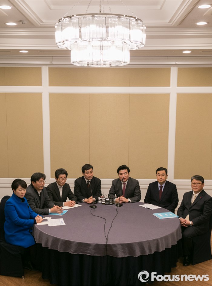 (서울=포커스뉴스) 11일 오전 서울 여의도 국회 귀빈식당에서 20대 총선 선거구 획정 기준 및 쟁점 법안 논의를 위해 진행된 여야 원내지도부 회동에 참석한 의원들이 취재진을 향해 모두발언을 하고 있다. 왼쪽부터 이언주 더불어민주당 원내대변인, 이춘석 원내수석부대표, 이목희 정책위의장, 이종걸 원내대표, 원유철 새누리당 원내대표, 김정훈 정책위의장, 조원진 원내수석부대표.