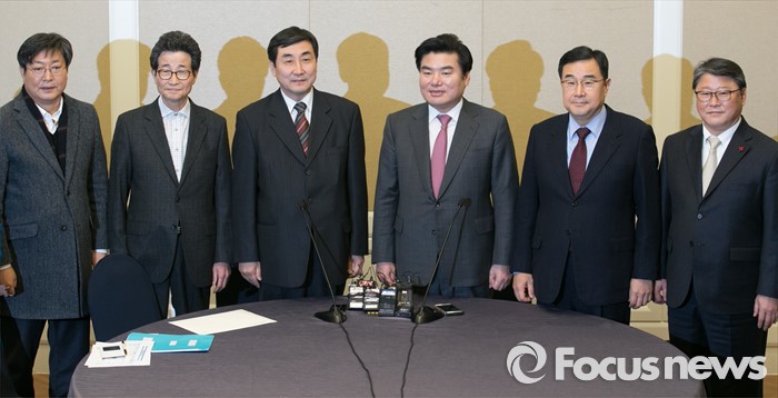 (서울=포커스뉴스) 11일 오전 서울 여의도 국회 귀빈식당에서 20대 총선 선거구 획정 기준 및 쟁점 법안 논의를 위해 진행된 여야 원내지도부 회동에 참석한 의원들이 취재진을 향해 포즈를 취하고 있다. 왼쪽부터 이춘석 더불어민주당 원내수석부대표, 이목희 정책위의장, 이종걸 원내대표, 원유철 새누리당 원내대표, 김정훈 정책위의장, 조원진 원내수석부대표.