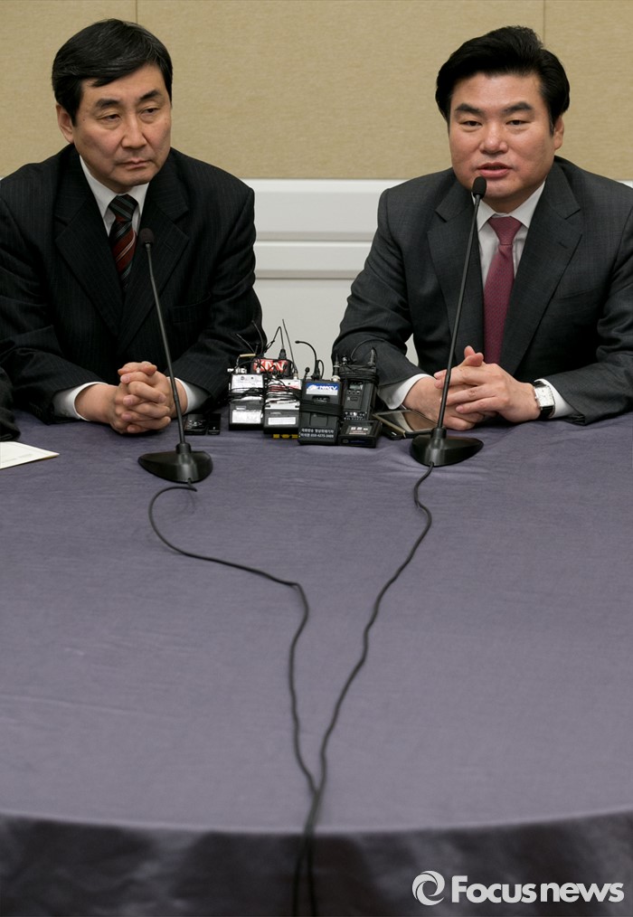 (서울=포커스뉴스) 11일 오전 서울 여의도 국회 귀빈식당에서 20대 총선 선거구 획정 기준 및 쟁점 법안 논의를 위해 진행된 여야 원내지도부 회동에 참석한 원유철(오른쪽) 새누리당 원내대표와 이종걸 더불어민주당 원내대표가 모두발언을 하고 있다.
