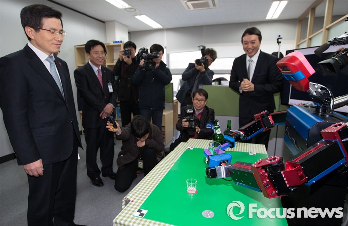 (대전=포커스뉴스) 황교안 국무총리가 11일 대전 유성구 융합기술연구생산센터 내 마젠타로보틱스를 방문, 도장로봇이 소맥 폭탄주제조 시연을 지켜보고 있다.