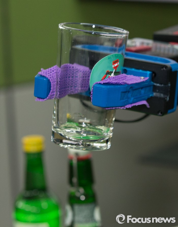 (대전=포커스뉴스) 황교안 국무총리가 11일 대전 유성구 융합기술연구생산센터 내 마젠타로보틱스를 방문, 도장로봇이 소맥 폭탄주제조 시연을 하고 있다.