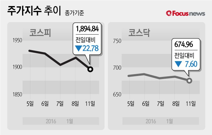 (서울=포커스뉴스) 11일 코스피지수는 전날 보다 1.19%(22.78포인트) 내린 1894.84에 장을 마쳤다. 코스닥지수는 전일 대비 1.11%(7.60포인트) 내린 674.96에 마감했다.