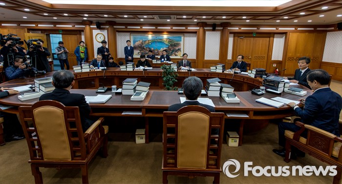 (과천=포커스뉴스) 이인복 중앙선거관리위원회 위원장이 11일 오후 경기도 과천시 중앙선거관리위원회에서 열린 전체회의에 자리해 회의를 주재하고 있다. 이날 이 위원장은 오는 4월 13일 총선 '선거구 실종' 장기화 사태에 따른 대책을 모색할 예정이다.