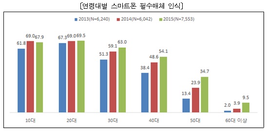 조사결과에 따르면 일상생활에서 가장 중요한 방송 매체로 스마트폰(46.4%)이 꼽혔다. TV는 44.1%로 2위를 차지했다. 특히 40대 연령층에서 스마트폰을 필수 매체로 인식하는 비중은 2013년 38.4%에서 지난해 54.1%로 급증해 스마트폰의 중요성이 고연령층으로 확산 추세인 것으로 나타났다.