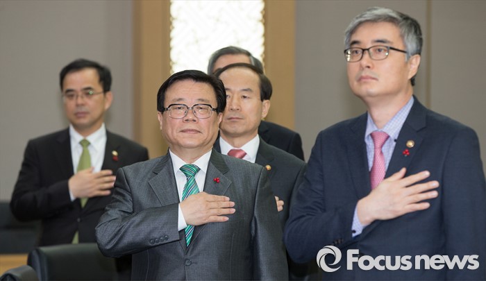 (세종=포커스뉴스) 12일 오전 세종시 정부세종청사 국무회의장에서 열린 서울-세종 영상 국무회의에 참석한 국무위원들이 국기에대한 경례를 하고 있다.