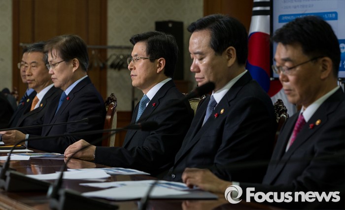 (서울=포커스뉴스) 12일 오전 서울 종로구 정부서울청사에서 황교안(가운데) 국무총리가 부패방지 4대 백신 프로젝트를 발표 후 자료를 검토하고 있다. 정부는 이날 발표를 통해 실시간 감시, 리스크 관리, 정보상시 공유ㆍ연계, 내부클린시스템의 4대 백신 프로젝트를 2016년 부터 16개 분야, 240조원 운용 규모의 공공시스템에 본격 가동한다고 밝혔다.