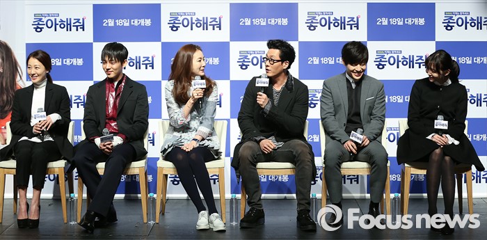 (서울=포커스뉴스) 12일 오전 서울 강남구 압구정 CGV에서 열린 영화 '좋아해줘' 제작보고회에 참석한 배우 김주혁(왼쪽 네번째)이 인사말을 하고 있다. 왼쪽부터 배우 이미연, 유아인, 최지우, 김주혁, 강하늘, 이솜