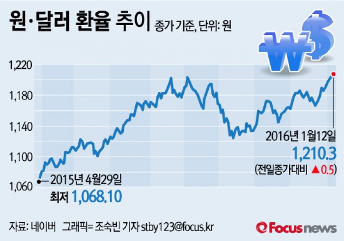 (서울=포커스뉴스) 12일 서울 외환시장에서 원-달러 환율은 전일 종가보다 0.5원 오른 1,210.3원에 장을 마감했다.