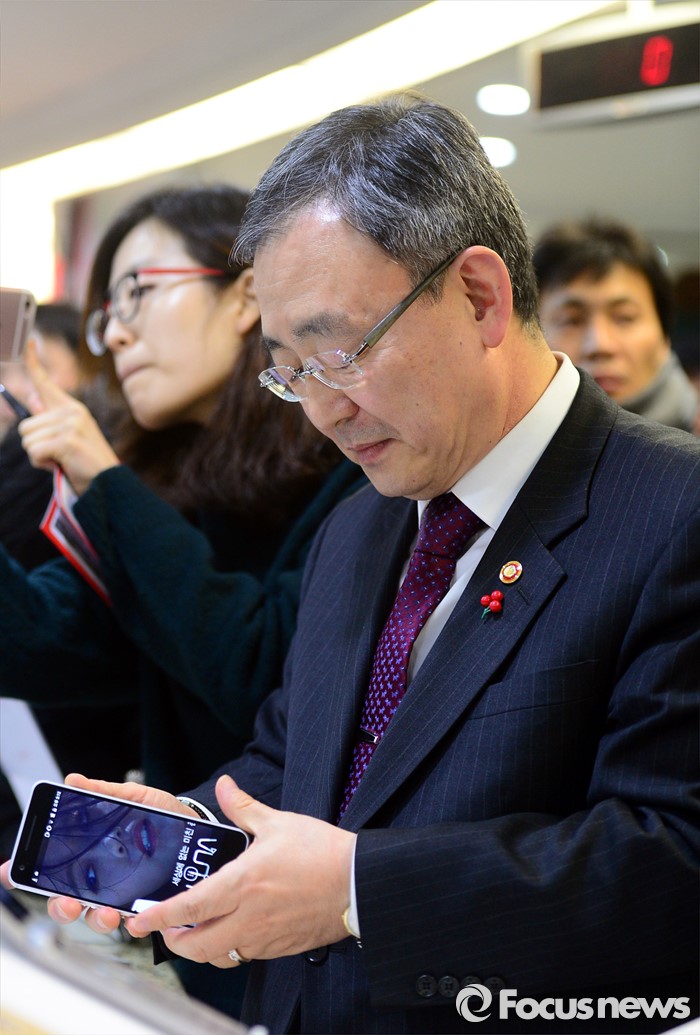 (서울=포커스뉴스) 13일 오후 서울 중구 중앙우체국 알뜰폰 판매창구를 찾은 최성준 방송통신위원장이 휴대폰을 살펴보고 있다.