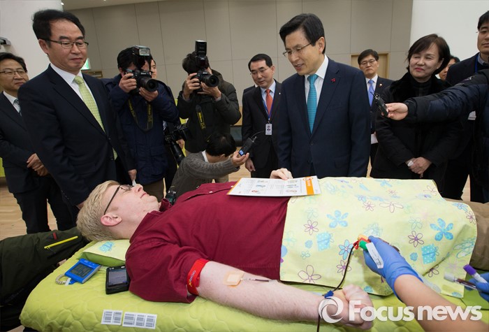 (세종=포커스뉴스) 황교안 국무총리가 13일 오후 세종시 정부세종청사 1동 대강당에서 열린 '국무총리실과 함께하는 사랑의 헌혈' 행사장을 방문해 헌혈에 동참하는 직원과 적십자사 관계자들을 격려하고 있다.