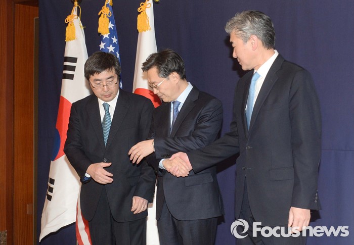 (서울=포커스뉴스) 한미일 6자회담 수석대표가 4차 핵실험을 감행한 북한에 대한 강력하고 실효적인 제재 방안 논의를 위해 13일 오후 서울 소공동 롯데호텔에서 만나 악수하고 있다. 왼쪽부터 이시카네 기미히로(石兼公博) 일본 아시아대양주국장, 황준국 외교부 한반도평화교섭본부장, 성 김 미 국무부 대북정책특별대표.