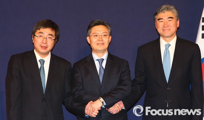 (서울=포커스뉴스) 한미일 6자회담 수석대표가 4차 핵실험을 감행한 북한에 대한 강력하고 실효적인 제재 방안 논의를 위해 13일 오후 서울 소공동 롯데호텔에서 만나 악수하고 있다. 왼쪽부터 이시카네 기미히로(石兼公博) 일본 아시아대양주국장, 황준국 외교부 한반도평화교섭본부장, 성 김 미 국무부 대북정책특별대표.