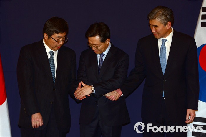 (서울=포커스뉴스) 한미일 6자회담 수석대표가 4차 핵실험을 감행한 북한에 대한 강력하고 실효적인 제재 방안 논의를 위해 13일 오후 서울 소공동 롯데호텔에서 만나 악수하고 있다. 왼쪽부터 이시카네 기미히로(石兼公博) 일본 아시아대양주국장, 황준국 외교부 한반도평화교섭본부장, 성 김 미 국무부 대북정책특별대표.