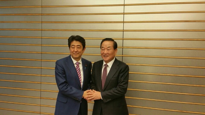 (서울=포커스뉴스) 13일(현지시간) 일본 도쿄 총리관저에서 서청원 새누리당 최고위원과 아베 신조 일본 총리가 면담을 마치고 기념촬영을 하고 있다. <사진제공=서청원 의원실>