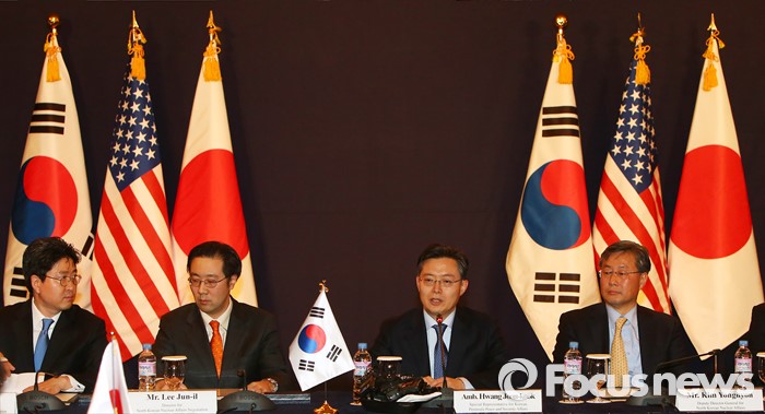 (서울=포커스뉴스) 13일 오후 서울 중구 롯데호텔에서 열린 한미일 6자회담수석 긴급회동에서 황준국 외교부 한반도평화교섭본부장(오른쪽 두번째)이 모두발언을 하고 있다.