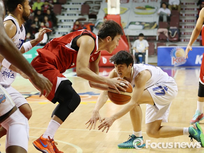 (안양=포커스뉴스) 13일 안양실내체육관에서 열린 2015-2016 프로농구 KGC-KCC 경기에서 KGC 박찬희가 KCC 신명호의 마크를 제치며 드리블하고 있다.
