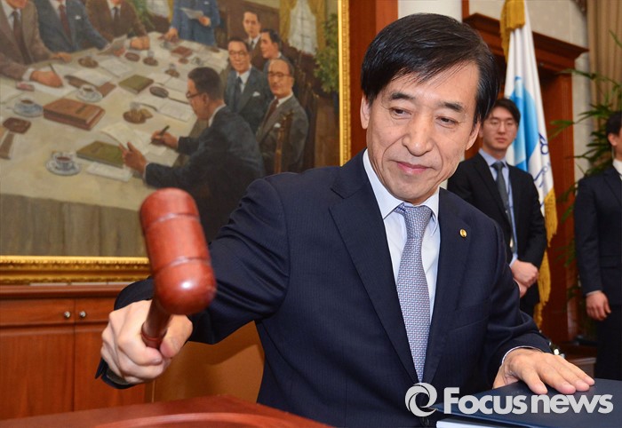 (서울=포커스뉴스) 이주열 한국은행 총재가 14일 서울 중구 한국은행 본관에서 열린 금융통화위원회의에서 의사봉을 두드리고 있다.