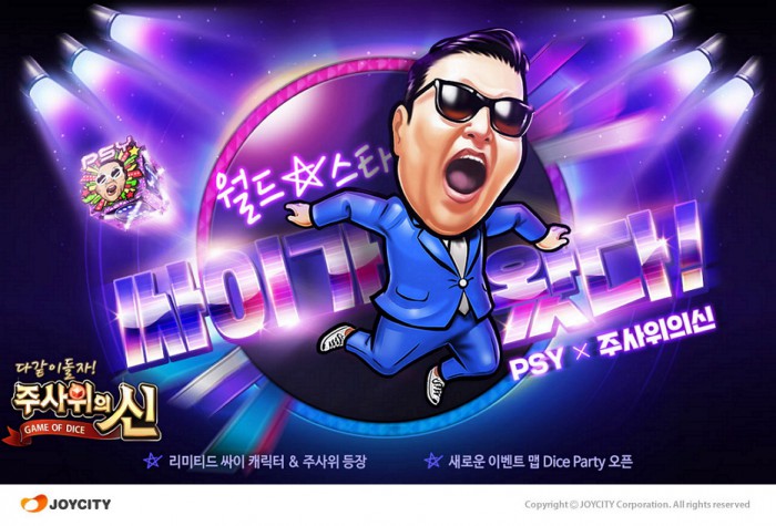 (서울=포커스뉴스) 조이시티(대표 조성원)는 모바일 보드게임 '주사위의 신'에 월드스타 싸이를 테마로 대규모 업데이트를 실시했다고 14일 밝혔다.