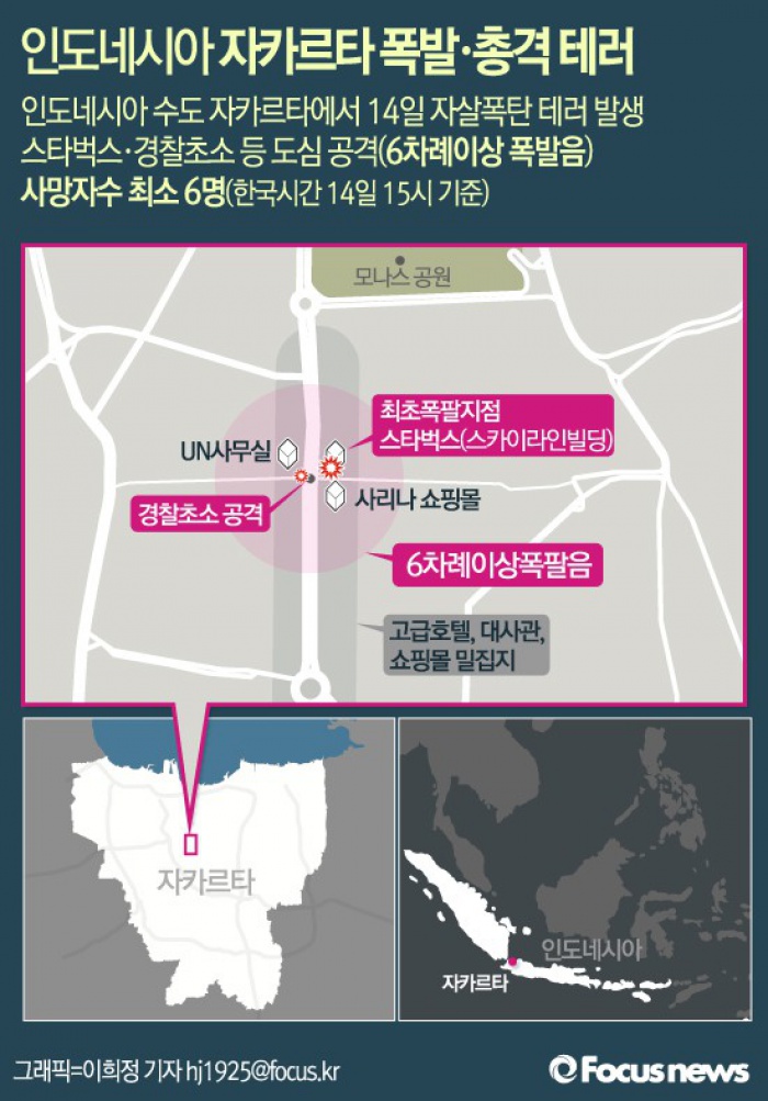 (서울=포커스뉴스) 인도네시아 수도 자카르타 도심에서 14일 오전(현지시간) 자살폭탄 테러 공격으로 추정되는 수 차례 폭발과 총격이 발생했다고 AP·AFP통신 등이 보도했다.
