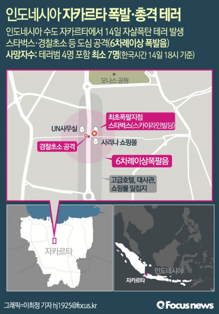 (서울=포커스뉴스) 인도네시아 수도 자카르타 도심에서 14일 오전(현지시간) 자살폭탄 테러 공격으로 추정되는 수 차례 폭발과 총격이 발생했다고 AP·AFP통신 등이 보도했다.