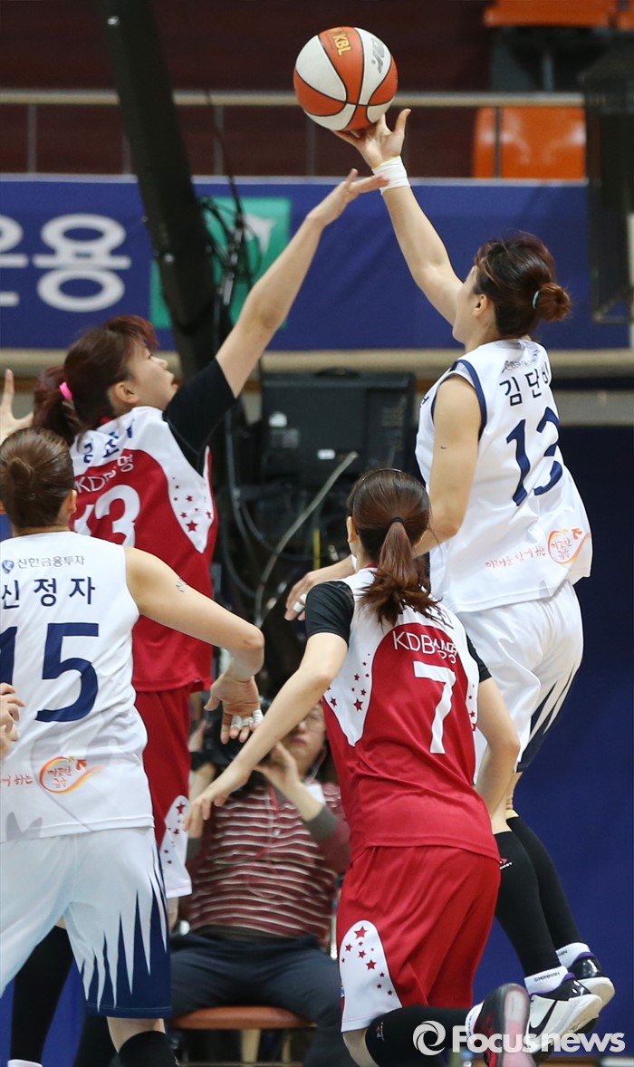 (인천=포커스뉴스) 14일 인천도원체육관에서 열린 2015~2016 여자프로농구 신한은행-KDB생명 경기에서 신한은행 김단비가 KDB생명 김소담의 마크를 받으며 레이업슛을 시도하고 있다.
