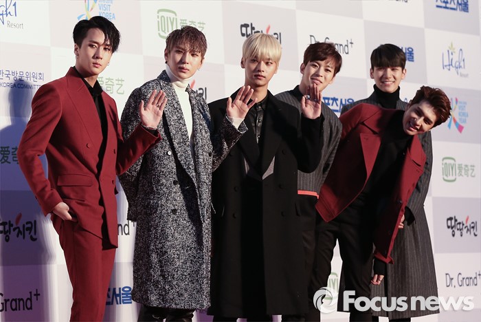 (서울=포커스뉴스) 14일 오후 서울 송파구 올림픽 체조경기장에서 열린 '25회 하이원 서울가요대상' 시상식에 참석한 아이돌그룹 빅스의 멤버들이 포토타임을 갖고 있다.