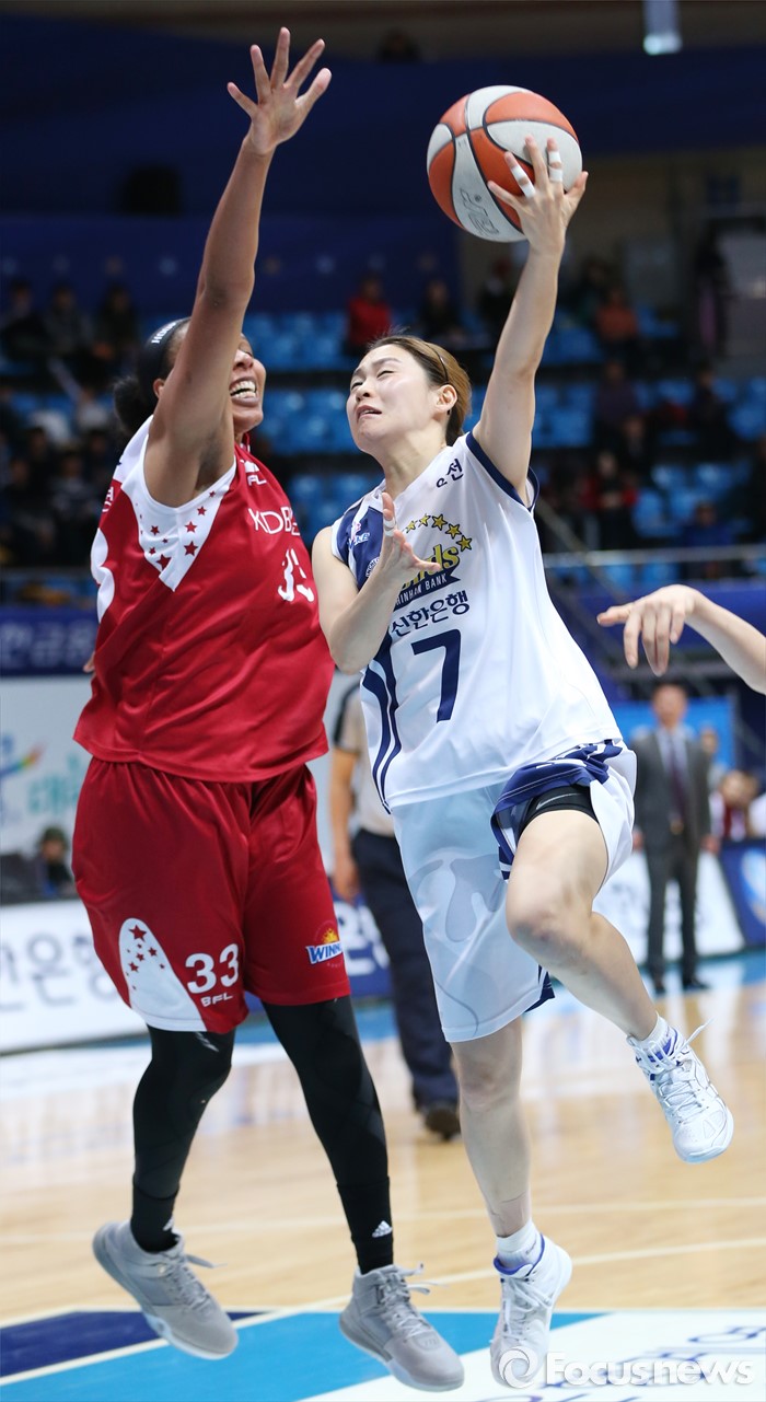 (인천=포커스뉴스) 14일 인천도원체육관에서 열린 2015~2016 여자프로농구 신한은행-KDB생명 경기에서 신한은행 윤미지가 KDB생명 플레넷의 마크를 받으며 레이업슛을 시도하고 있다.