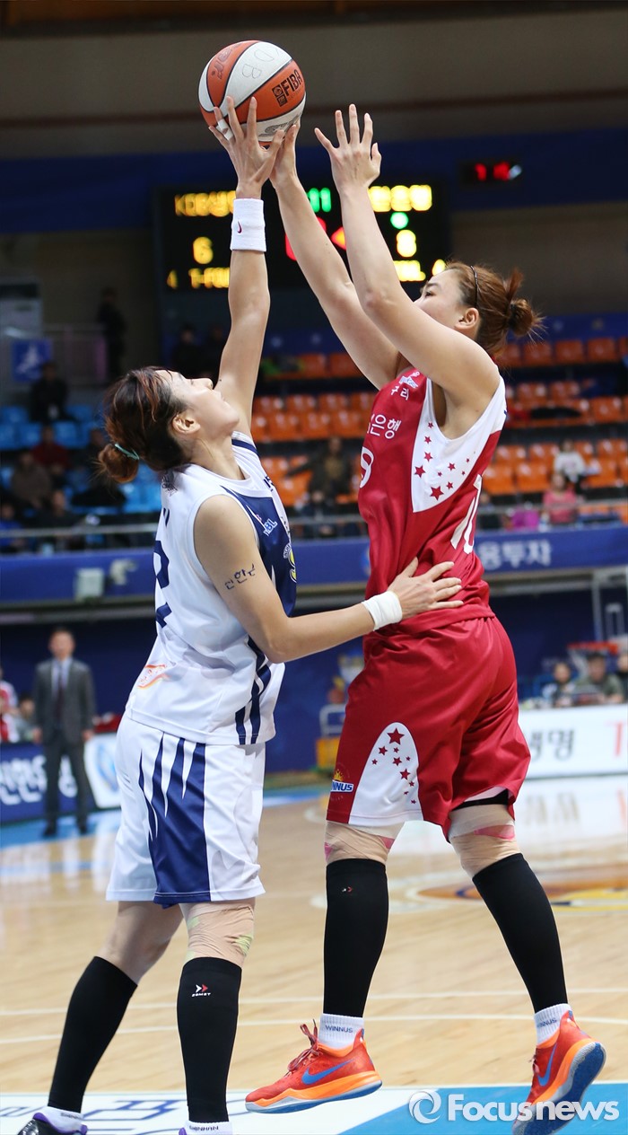 (인천=포커스뉴스) 14일 인천도원체육관에서 열린 2015~2016 여자프로농구 신한은행-KDB생명 경기에서 신한은행 김단비가 KDB생명 최원선의 슈팅을 블로킹하고 있다.