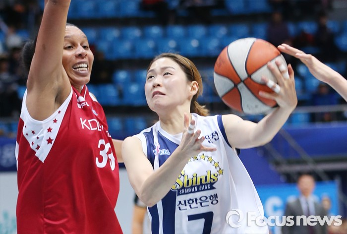 (인천=포커스뉴스) 14일 인천도원체육관에서 열린 2015~2016 여자프로농구 신한은행-KDB생명 경기에서 신한은행 윤미지가 KDB생명 플레넷의 마크를 받으며 레이업슛을 시도하고 있다.