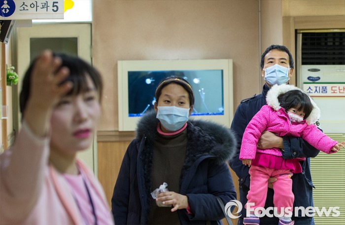 (서울=포커스뉴스) 인플루엔자 유행주의보가 발령된 15일 오전 서울 용산구 소화아동병원에서 한 부부가 자녀와 진료실로 향하고 있다.