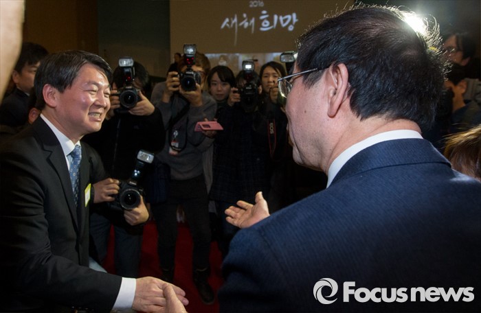 (서울=포커스뉴스) 15일 오후 서울 노원구청 대강당에서 열린 2016 노원구 신년인사회에 참석한 안철수(왼쪽) 국민의당 인재영입위원장과박원순 서울시장이 악수하고 있다.
