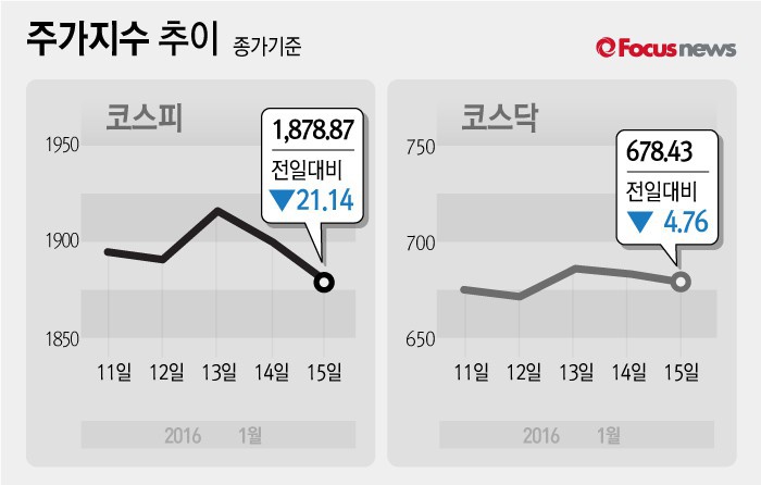 15일 코스피지수는 전일 대비 1.11%(21.14포인트) 내린 1878.87에 장을 마쳤다. 코스피가 1880선을 하회한 것은 지난해 9월 8일 이후 처음이다.