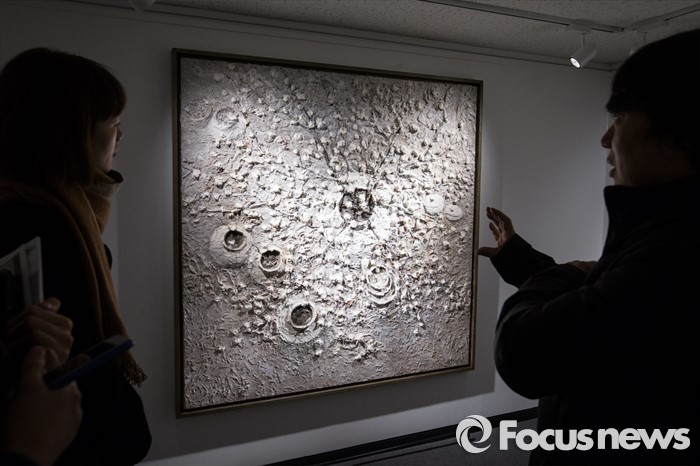 (서울=포커스뉴스) 15일 오후 서울 용산구 갤러리 조은에서 김덕용, 전병현 작가의 '갤러리 조은 개관전'이 열리고 있는 가운데 전병현 작가가 취재진에게 작품을 설명하고 있다.