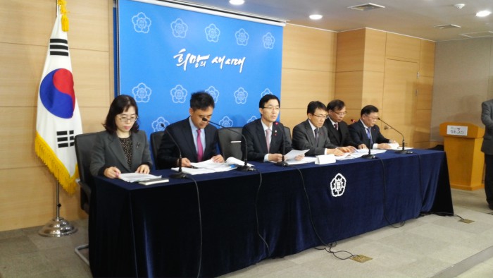 방문규 차관은 “지난해 한미약품이 8조원대 기술을 수출했다”며 “제약산업에 있어 R&D가 중요하다. 복지부는 향후에도 R&D 투자지원 규모를 확대해 나갈 것”이라고 말했다.방문규 보건복지부 차관(왼쪽에서 세번째)이 보건복지부 2016년 업무보고에 대해 설명하고 있다. <사진=민승기 기자>