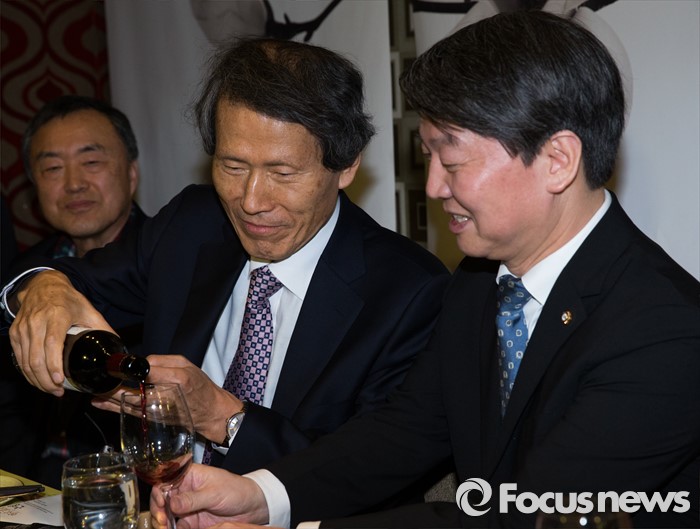 (서울=포커스뉴스) 한상진(가운데) 국민의당 창당준비위원장이 15일 오후 서울 관악구 한 태국 식당에서 진행된 故 김대중 전 대통령 재임 당시 자문정책기획위원회 모임에 참석해 안철수(오른쪽) 인재영입위원장의 술잔에 와인을 따르고 있다.