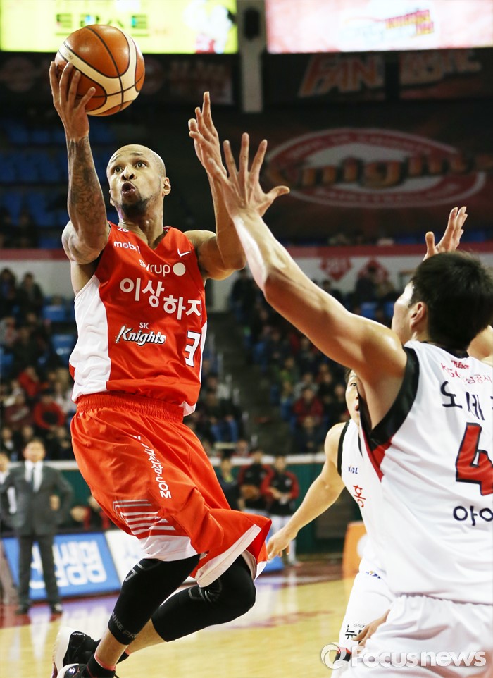 (서울=포커스뉴스) 15일 서울 잠실학생체육관에서 열린 2015-2016 프로농구 SK-KGC 경기에서 SK 스펜서가 KGC 오세근의 수비를 피해 레이업슛을 시도하고 있다.